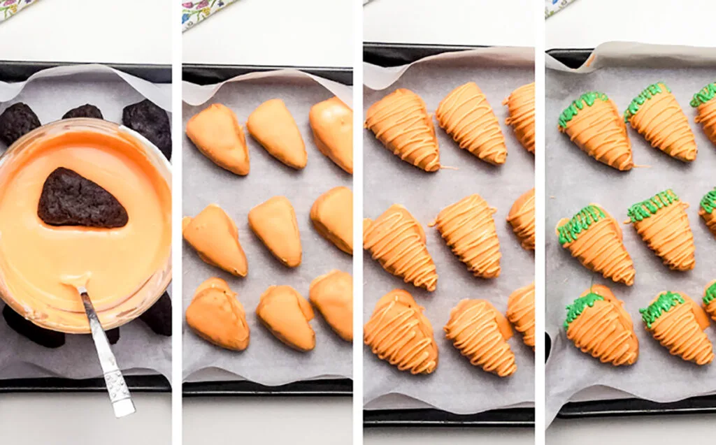 Yes! Shape and freeze the brownie carrots in advance, then dip and decorate them when you’re ready to serve.