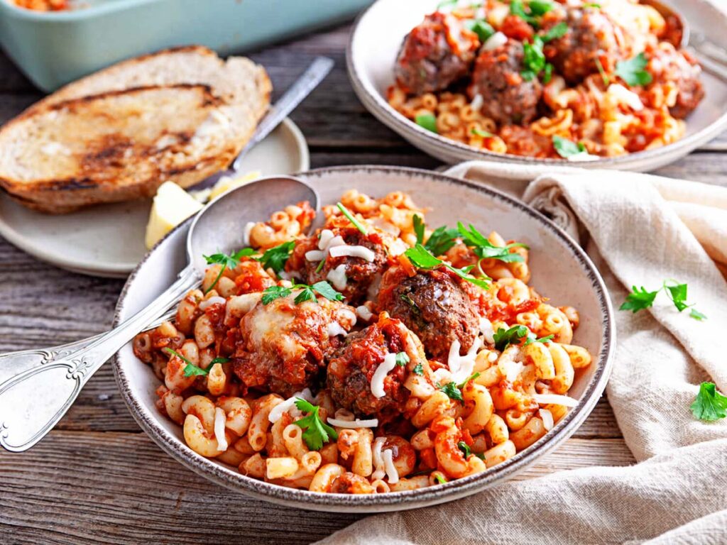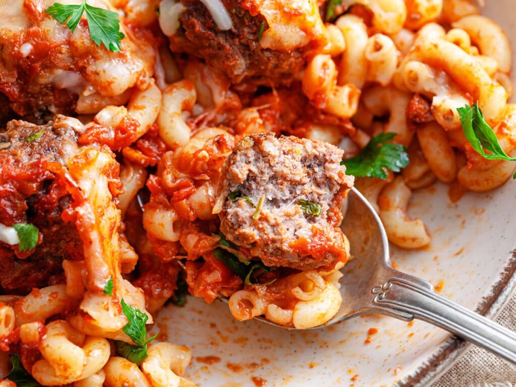 Yes. If the frozen meatballs are already fully cooked, you can use them as a shortcut. Just layer them over the pasta, add the sauce and cheese, and bake until everything is hot and bubbly. This is one of the easiest ways to turn it into a super practical lazy dinner.