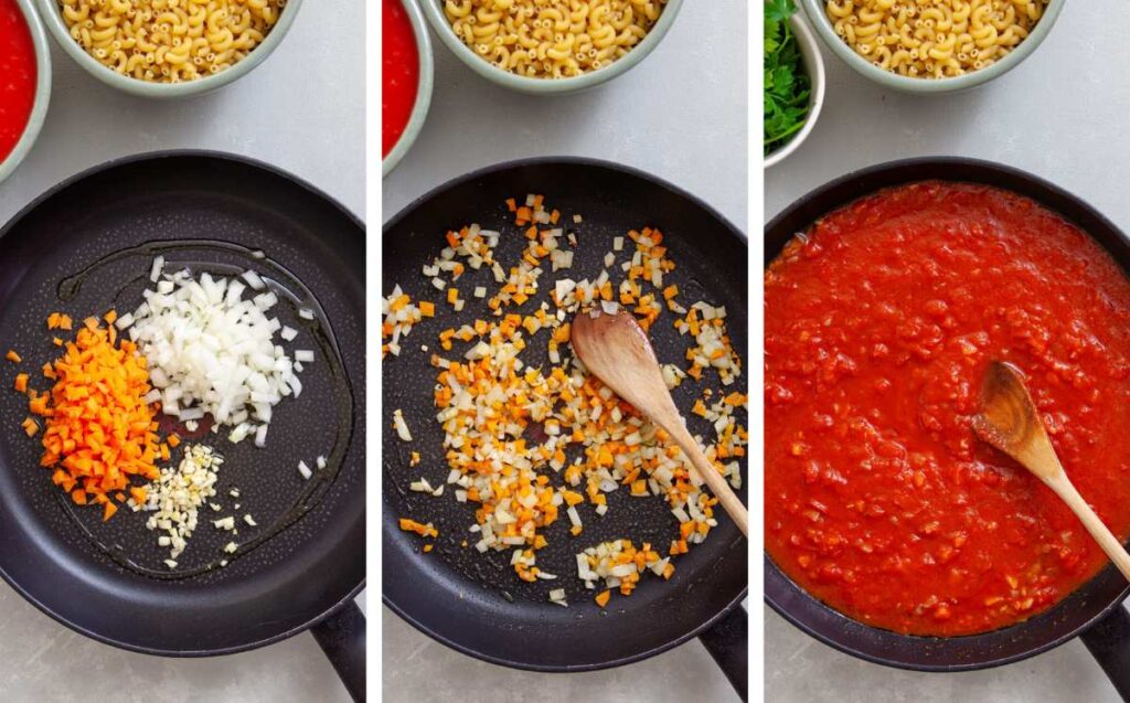 - 2 small carrots, diced– These add a little natural sweetness to the sauce and help balance the acidity of the tomato puree. If you want a smoother sauce, you can grate them instead of dicing.