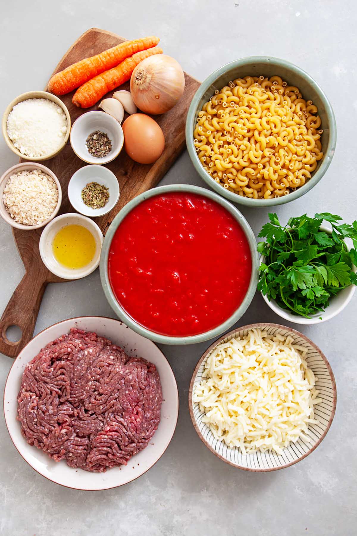 6. In a medium mixing bowl, add the ground beef, the grated half of the onion, panko breadcrumbs, parmesan, egg, dried oregano, dried basil, and half of the chopped parsley. Season generously with salt and pepper. Using clean hands, gently mix everything together just until combined. Try not to overmix, because working the meat too much can make the meatballs dense and tough. The mixture should feel well combined and easy to shape.