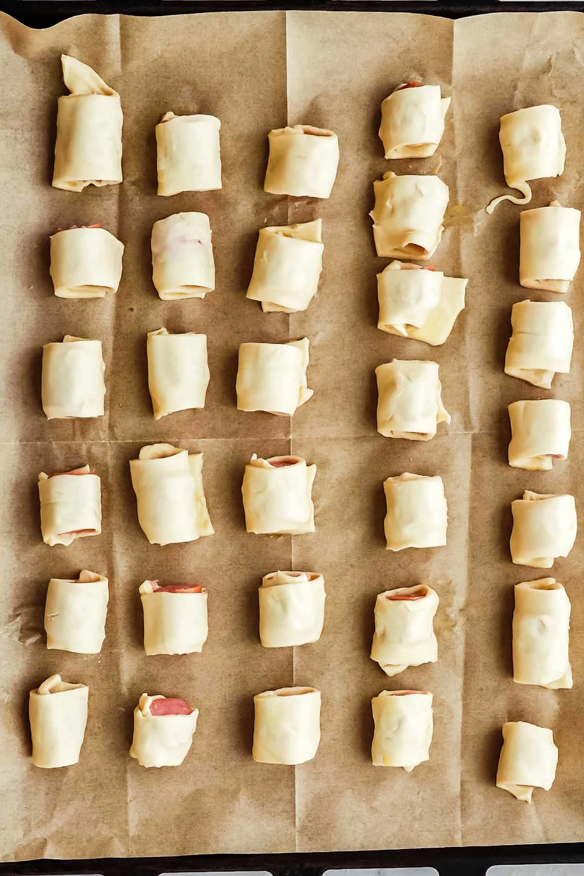 Assemble: Brush one end of a pastry strip with egg wash. Place a piece of hot dog on the strip and roll it up snugly. Repeat with the remaining pieces.