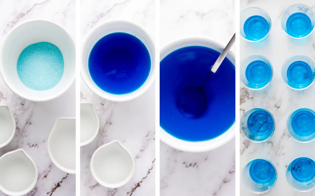 - In a bowl, dissolve the blue Jell-O in 1 cup of boiling water.